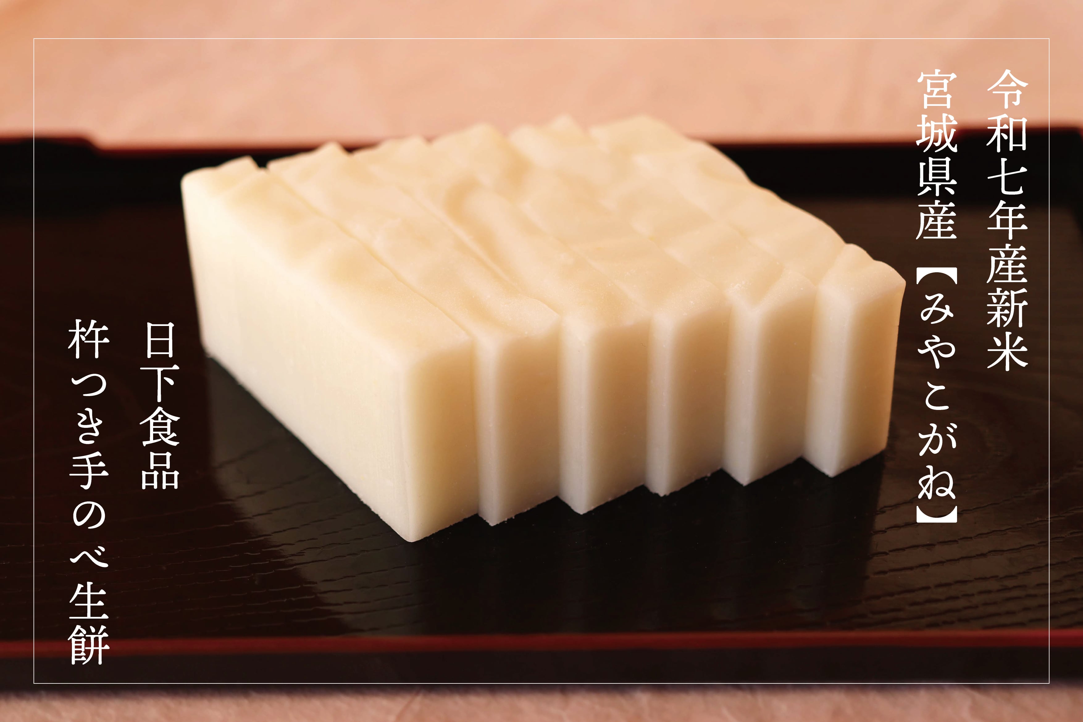 もち米は宮城県産水稲もち米「みやこがねもち」を使用。自家精米し、蒸し上げる時の蒸気だけでしっかり杵つき(加水なし)し、餅箱で手延べした、なめらかでこしのある餅です。