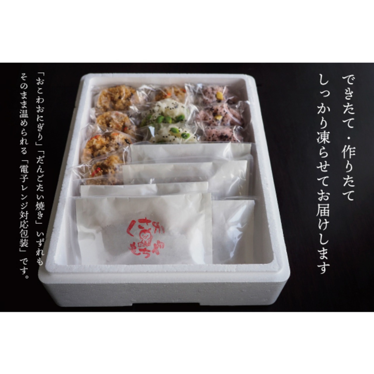 日下食品直営茶屋「甘味堂くさかもちや」でもお持ち帰りやセットメニューで人気の「おこわおにぎり」3種類に、令和3年の発売以来好評の「だんごたい焼き」をセットにして【もちやの冷凍便】でお届けします。